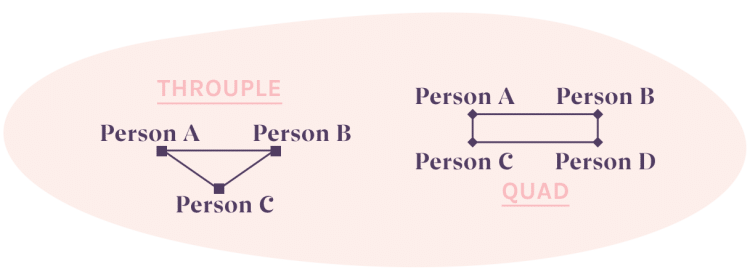 Unlike the closed V where only one person is romantically involved with two others, a throuple, or quad, is when three people – or four in a quad – are all romantically or sexually involved with one another [5].